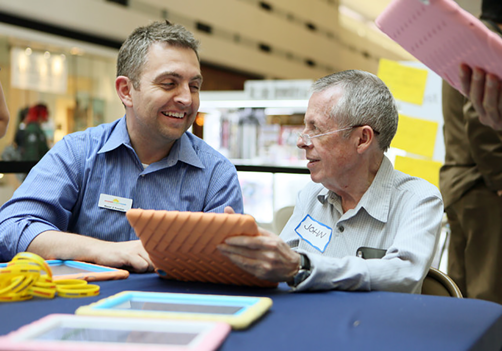 Conducting surveys and giving one-on-one attention to senior citizens at a community open house at the mall.