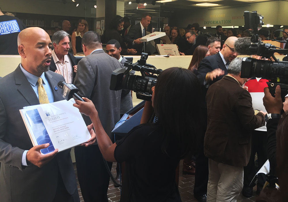 Bronx Borough President Ruben Diaz Jr. fields questions from local reporters about Arthur Avenue. Photo by Michael Johnson.