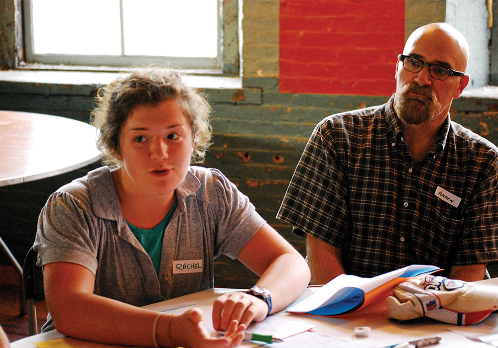 As part of the Community Heart & Soul project in Biddeford, Maine, youth were invited to community meetings to discuss the future of their city. The project created a downtown master plan for Biddeford that helped spark revitalization. Biddeford High School teacher Carolyn Gosselin (right) and her class gathered stories from community members about the town's rich textile mill history. Courtesy Orton Family Foundation.