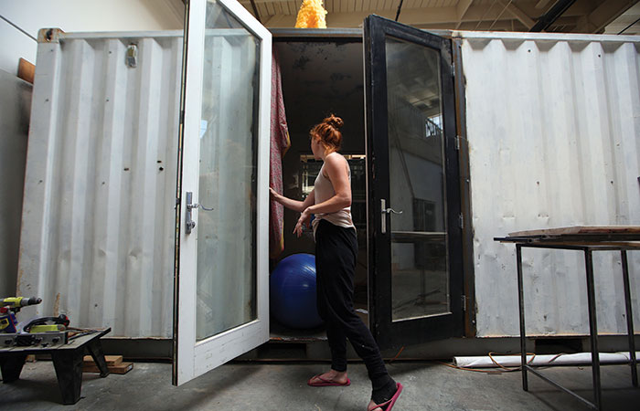 Heather Stewart at her home in Containertopia, a village of 160-square-foot shipping containers, in Oakland, California. These containers and tiny houses on wheels are making a mark in a city where rents are rising with an influx of newcomers. Photo by Jim Wilson/The New York Times.