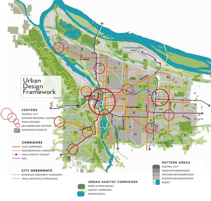Portland, Oregon's draft comprehensive plan update (portlandoregon.gov/bps/68411), slated for adoption early in 2016, includes an Urban Design Framework diagram that identifies centers and corridors (areas that are expected to grow and change) within the city's physical context. The framework supports the evolution of the city by illustrating the linkages and relationships between various elements of the built and natural environment through a network of place types: centers, corridors, transit station areas, city greenways, urban habitat corridors, and employment areas. It also identifies a set of "pattern areas" — broad geographies that are defined by existing patterns of natural and built features, such as the central city, neighborhoods, and inner-ring districts, and provides basic urban design characteristics and comparisons for different types of centers, corridors, and other features.