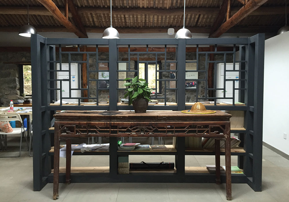 The planning studio and Children's Study Center was once the millet house. The steel folding screen echoes the pattern of the vernacular wood window decoration. Photos by Xin Kai.