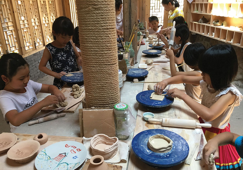Children making clay objects in the village art studio. Photo by Xin Kai.