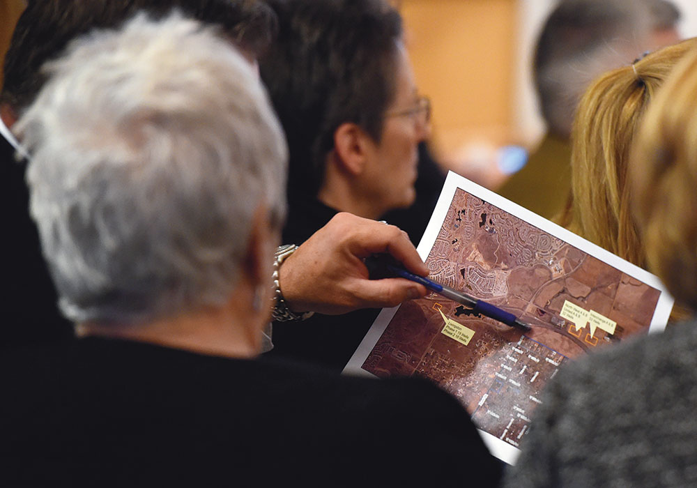 A resident studies a map during a discussion of a new memorandum of understanding between Broomfield and Extraction Oil & Gas. Photo by Jeremy Papasso, Daily Camera.