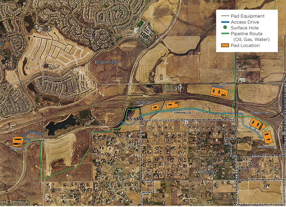 On the Front Line in Broomfield: After its moratorium on drilling was ruled unconstitutional, Broomfield, Colorado, added an oil and gas chapter to its comprehensive plan. Later, it negotiated a memorandum of understanding with Extraction Oil & Gas that provides greater setbacks and fewer wells. At left, drilling sites hug the Northwest Parkway, not far from residential neighborhoods. Map courtesy Broomfield, Colorado.