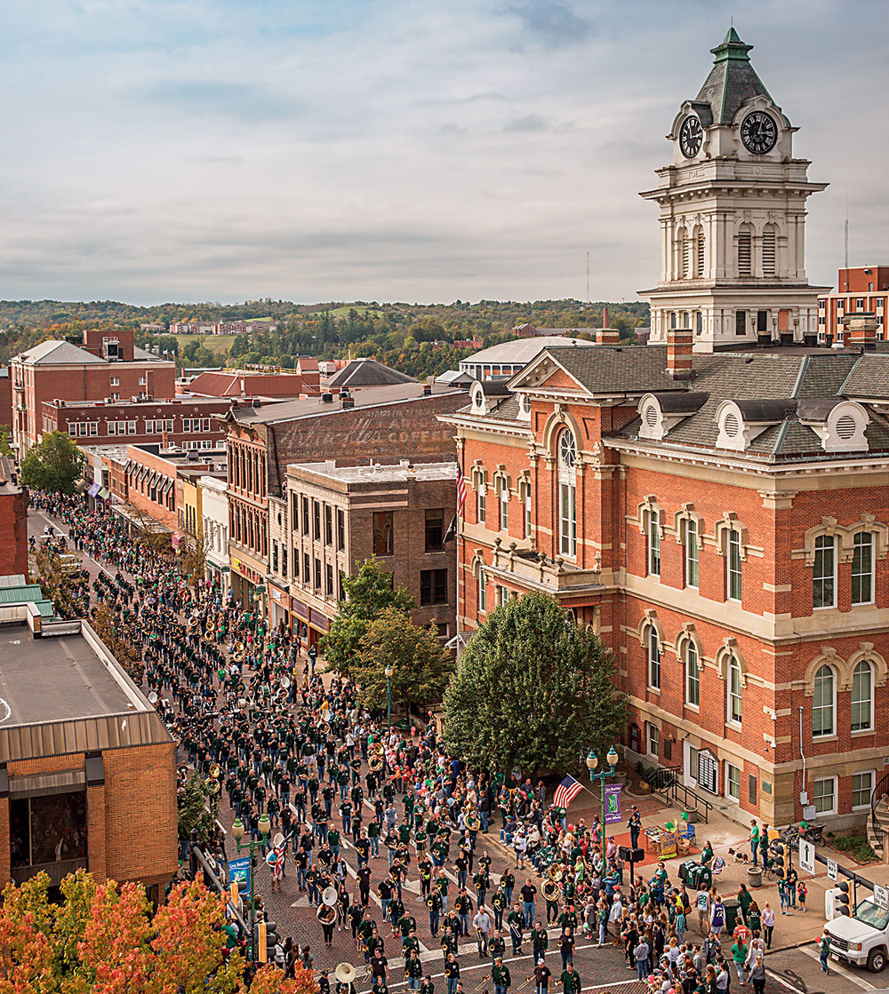 In Uptown Athens, Ohio, local businesses are still holding their own. The city is a regional draw for about 100,000 people — even more during Ohio University's Homecoming Parade, when retailers decorate with the school's colors. Photo courtesy Athens County Convention and Visitors Bureau.