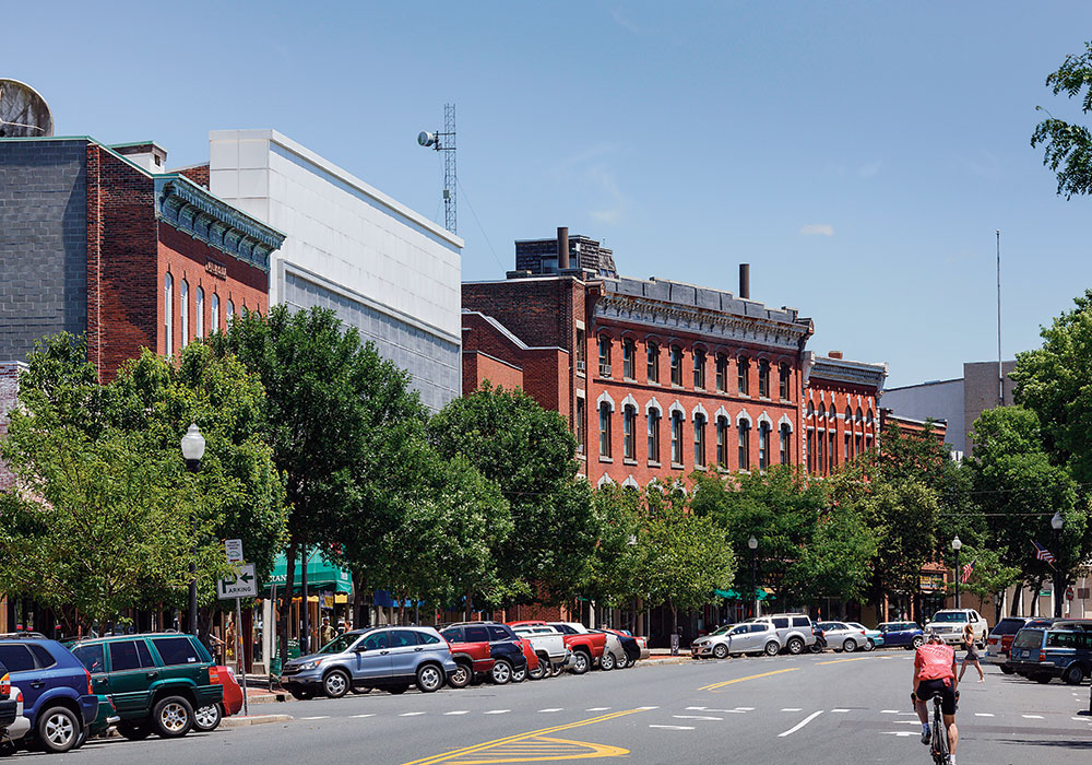 Downtown Greenfield, Massachusetts, is working to reinvent itself through zoning changes to encourage mixed uses and attracting services that aren't available with a click of a mouse. Photo by Philip Scalia/Alamy Stock Photo.