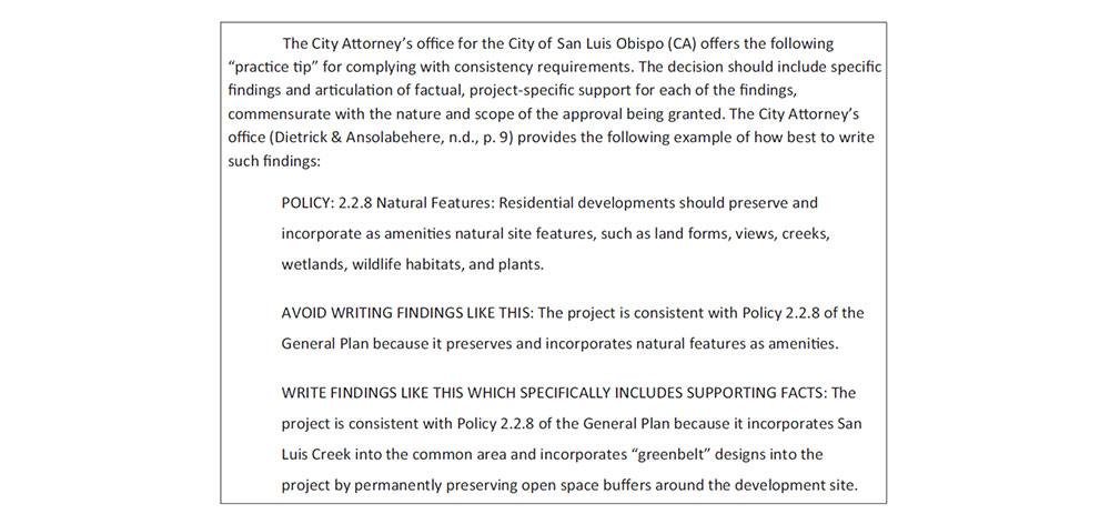 Ohm notes that one way to clarify consistency between a comprehensive plan and legal decisions is through planning staff reports. Staff reports can help decision-makers understand their community's comprehensive plan to better frame their decisions. Because these decision-makers typically do not have detailed knowledge about the comprehensive plan, a staff report could act as a vehicle to provide them with critical information to cite as the basis for their decision.