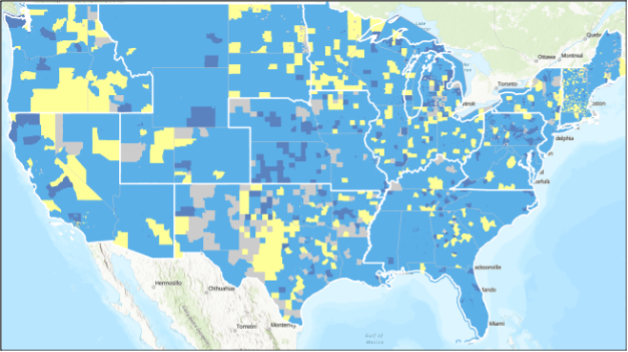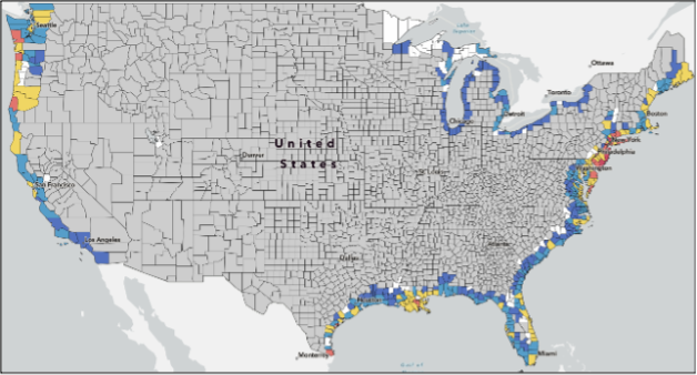 An analysis of the NRI reveals that eight out of 10 states with the highest average county risk score were among those with the most shoreline. Coastal regions often have large population centers with major infrastructure vulnerable to such threats as hurricanes, tsunamis, and flooding. Coastal flooding risk is one of the 18 natural hazard risk maps made available by NRI data (Figure 2).