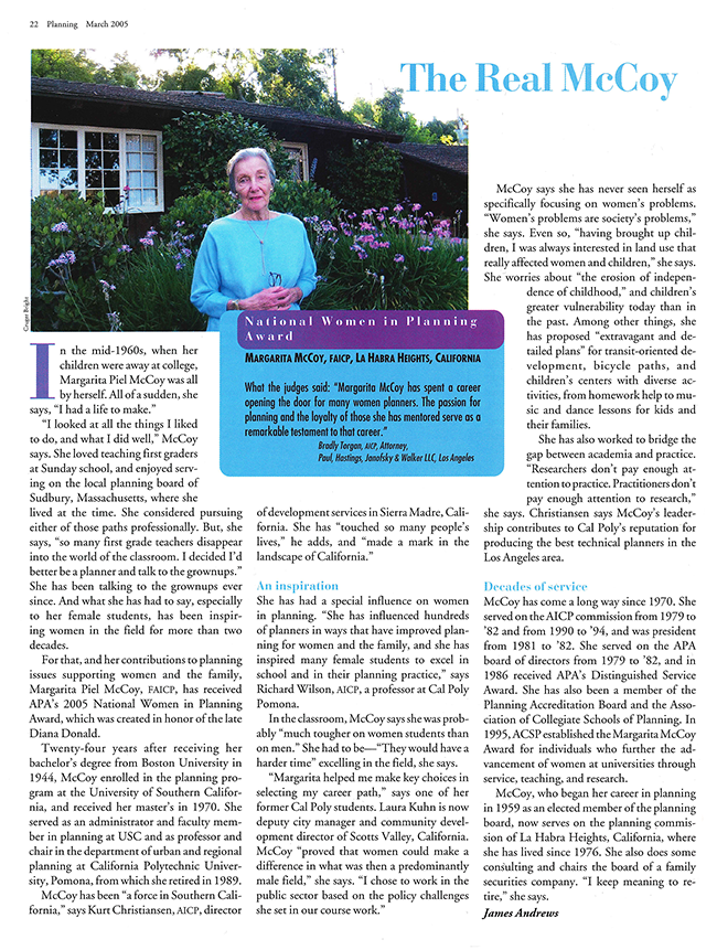In 2005, McCoy received the APA National Women in Planning Award. Below is the Planning magazine (March 2005) article about her contributions to the planning profession.