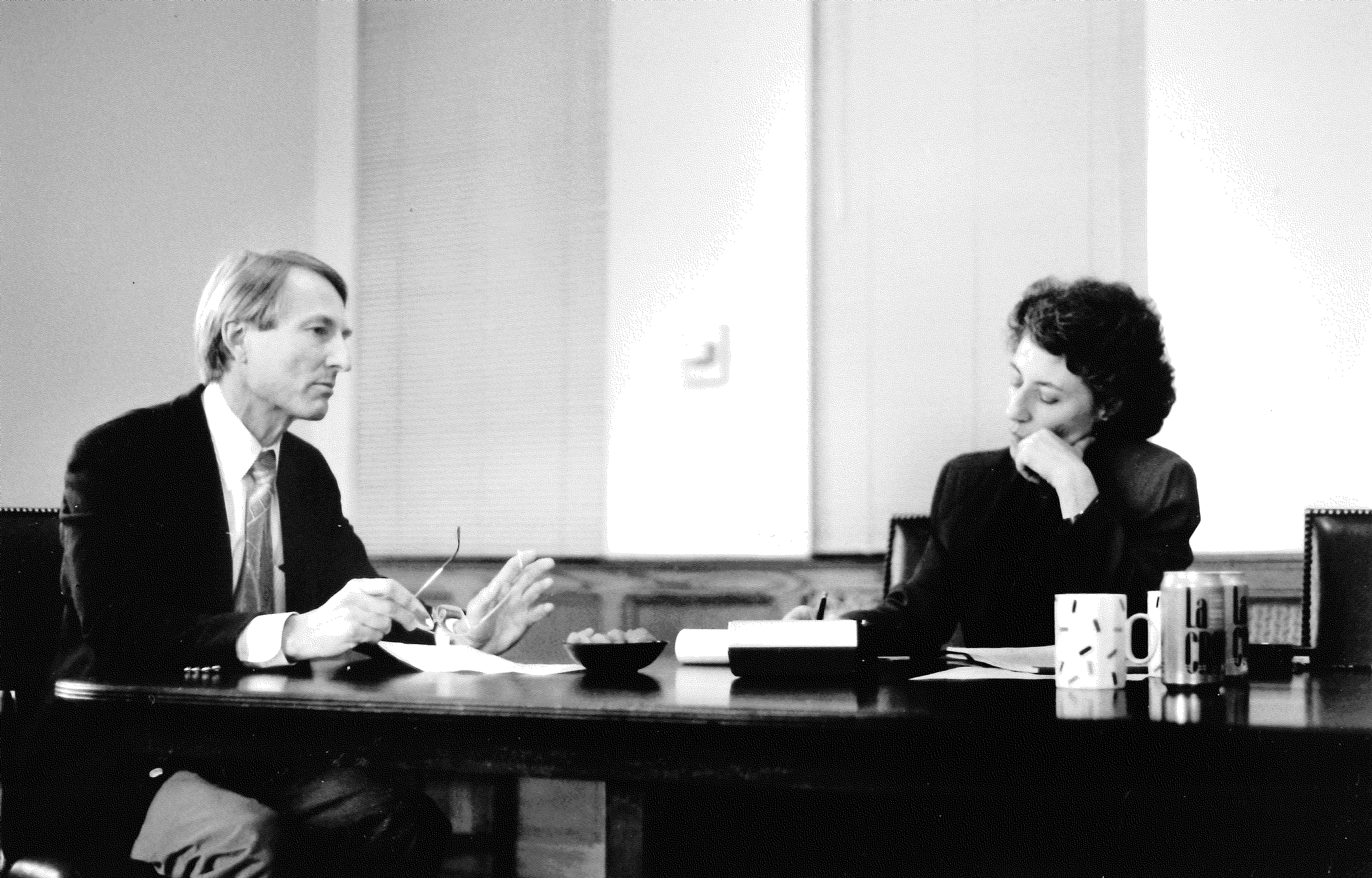 December 1993: Sylvia Lewis, editor of Planning magazine, interviews APA Executive Director Michael Barker in APA's former offices at 1313 E. 60th St. in Chicago. Photo by Richard Sessions/APA.