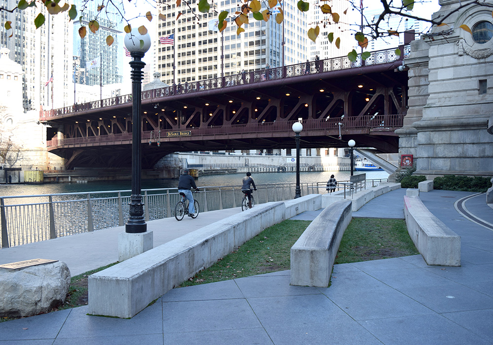 Cyclists ride along the recently developed Chicago Riverwalk, which features recreational infrastructure, restaurants, and numerous pedestrian seating areas along the Chicago River. The double-decker DuSable Bridge sits overhead. Photo by Kelly Wilson.