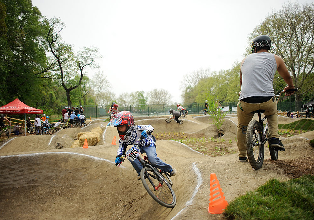 Bicyclists at the opening day of the Philly Pumptrack at Parkside Evans, dedicated in 2014. Photo by Albert Yee.