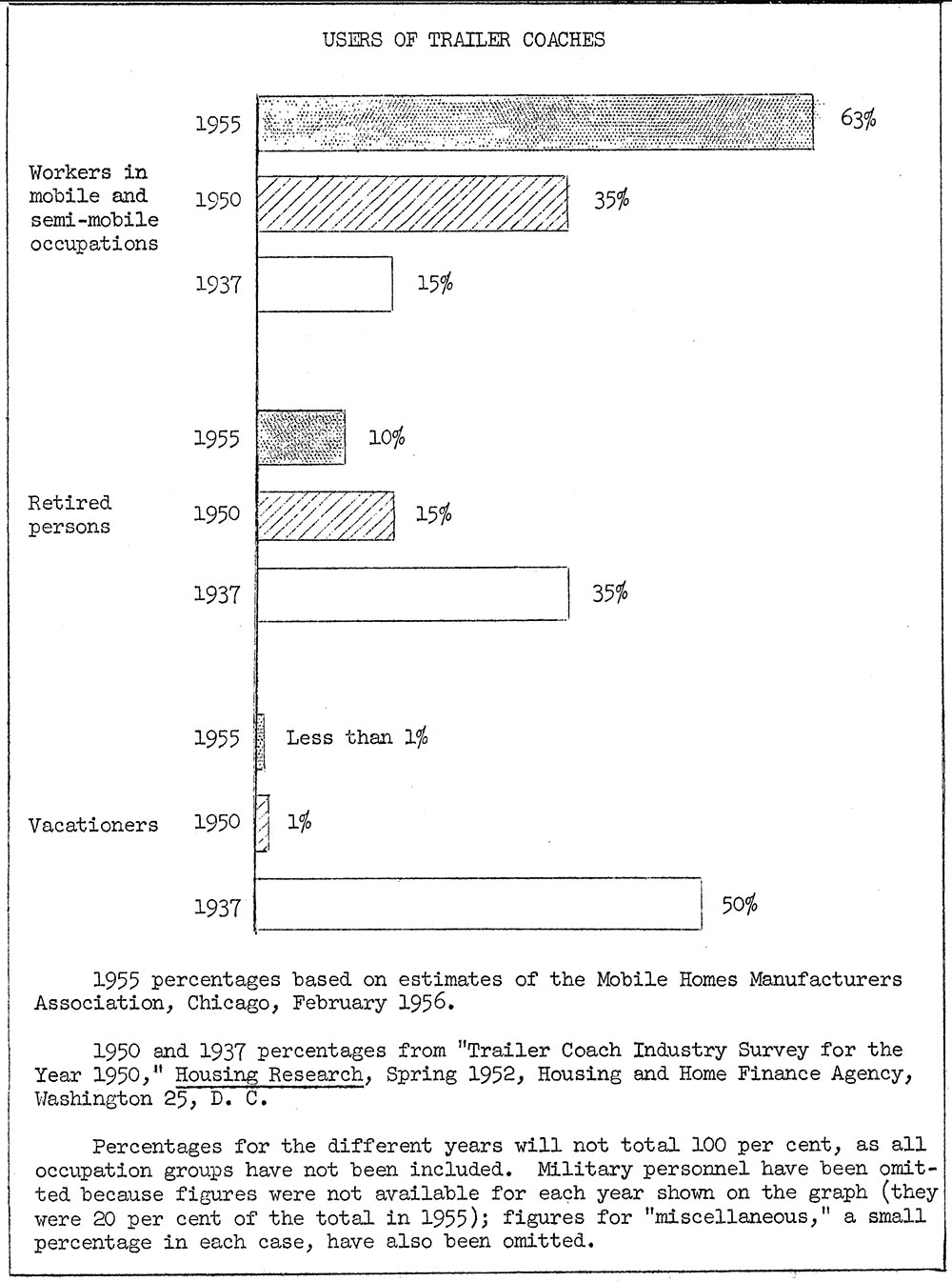 At any rate, of those who are mobile, whatever the reason, workers in mobile and semi-mobile occupations are more likely to be "permanent" trailer dwellers than any other group. That is, although they move their trailer homes from one community to another fairly frequently, they are more likely to adopt trailering as a permanent way of living than other groups. Their mobile homes are a convenience in their jobs — to them and often to the communities in which they are employed.
