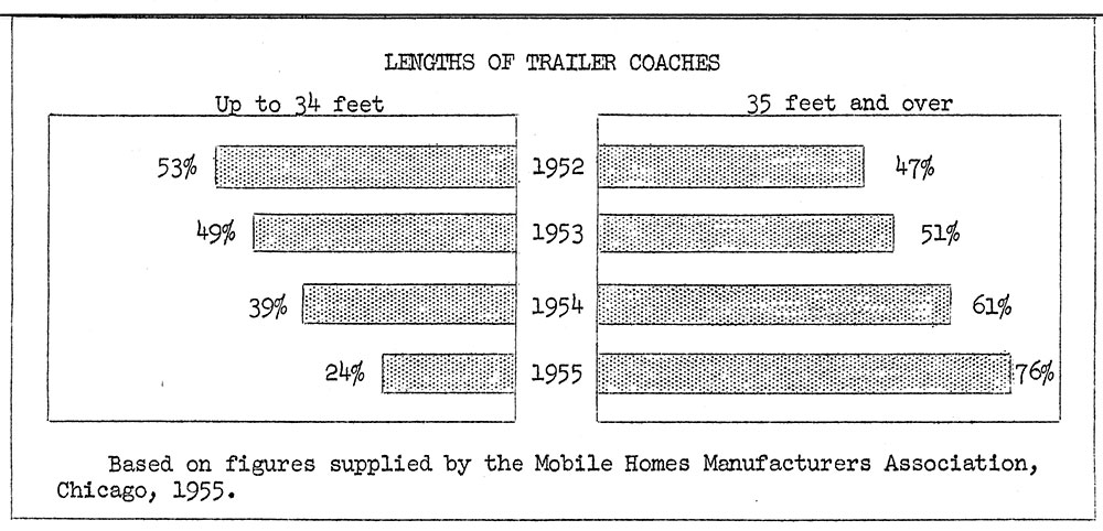 A far cry from the seven- or eight-foot sleeping trailers of the thirties are the 50-foot mobile dwellings manufactured today. As the bar chart below indicates, the percentage of trailers manufactured that are 35 feet or more has steadily increased in recent years.