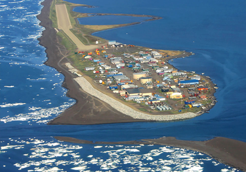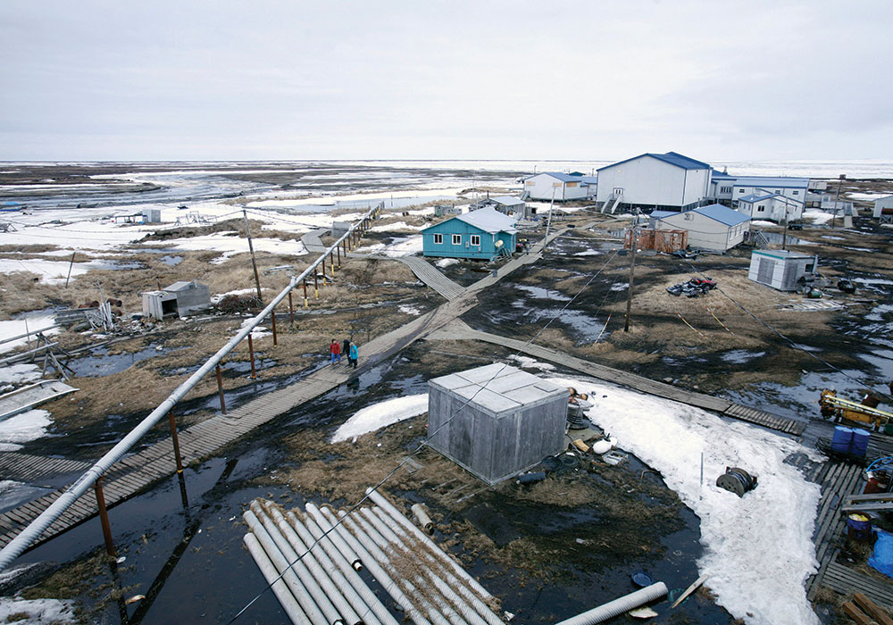 Kivalina is falling into the ocean. Located 85 miles north of the Arctic Circle in northwest Alaska, in a region accessible only by air or boat, the tribal community of approximately 400 Iñupiat is situated on a low-lying spit of land that juts into the Chukchi Sea. According to a report issued by the National Oceanic and Atmospheric Administration, the village lost 27 of its 54 acres between 1952 and 2003 as a result of coastal erosion.