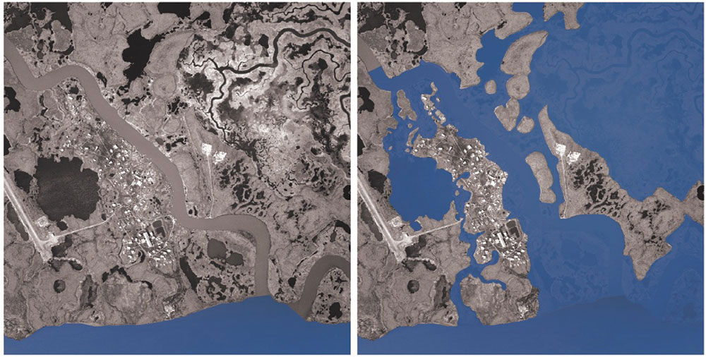 Newtok before (left) and after (right) a major flood on September 22, 2005. The floodwaters completely encircled the village, effectively making it an island for several days. Some houses were only connected to the village via temporarily floating boardwalks.