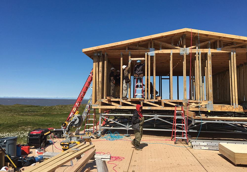 New housing is critical if Newtok will be able to make the move to Mertarvik; much of the existing housing stock is in poor repair. This demonstration house is being built using structural insulated panels and has a moveable foundation for transport across the ice. Courtesy CCHRC.
