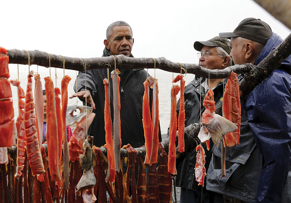 President Barack Obama observes traditional salmon preserving with fishermen in Dillingham on the shore of the Nushagak River in September 2015. Dillingham is one of the Alaskan communities identified as "imminently threatened" by flooding and erosion. Reuters/Jonathan Ernst.