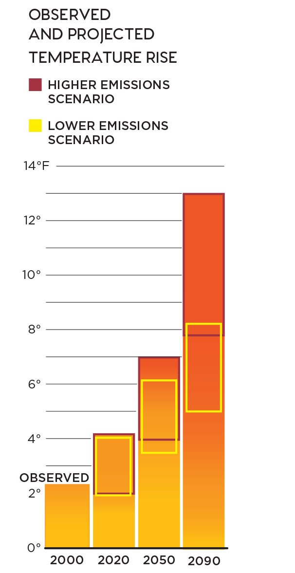 Warmer temperatures increase the threat to Alaska's coastal communities. The state's annual average temperature has risen 3. 4°F over the past 50 years. The observed increase shown here compares the average temperature of 1993–2007 with a 1960s–1970s baseline, an increase of over 2°. The brackets on the thermometers represent the likely range of model projections, though lower or higher outcomes are possible. Source: CMIP2-A.