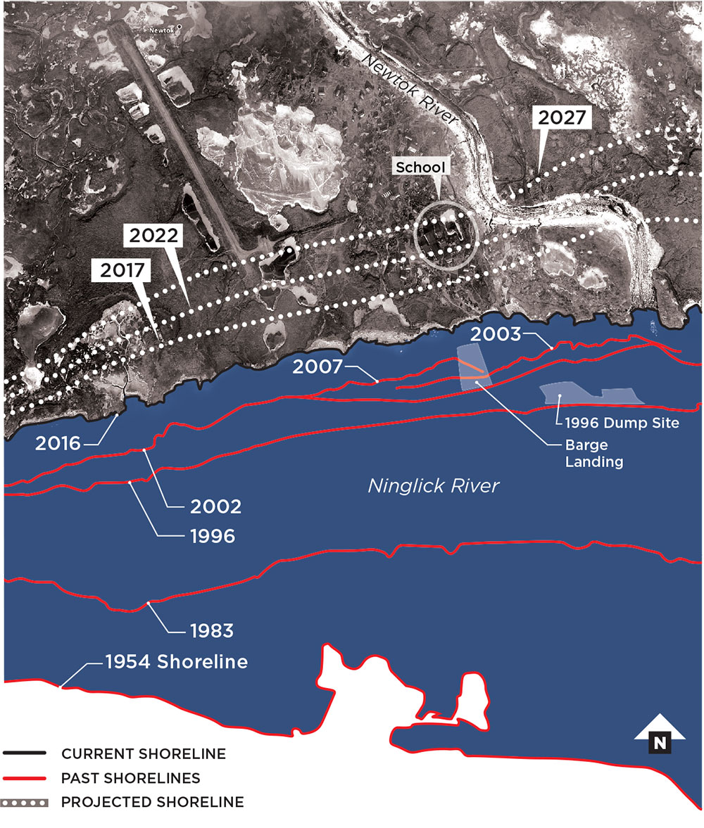 The Ninglick River has been eating into Newtok at an average of 72 feet per year, ranging up to 300 feet in a single stormy season. A 1996 dump site and barge landing are already under water; Newtok could lose its school by 2027 if projections prove accurate.