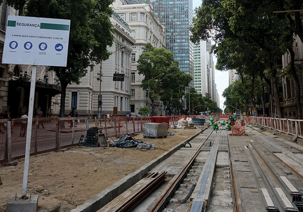 Construction on Rio Branco Avenue for Rio's new light-rail lines, called the VLT (for Light Vehicle on Rails). Projected to cost a total of R$1.15 billion, the system will eventually comprise 28 kilometers and 32 stops, making it one of Rio's most ambitious legacy projects for the 2016 Olympic Games.