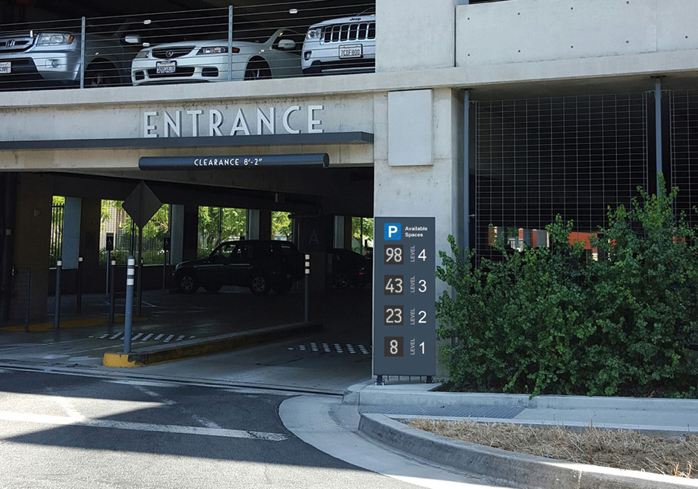 Parking guidance technology helps drivers get real-time information about the number of available spaces on each level before they even enter the garage. Photo courtesy INDECT USA.