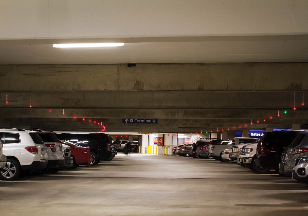 Inside the garages, sensor-activated green lights show available spots — meaning drivers don't cruise. Photo courtesy INDECT USA.