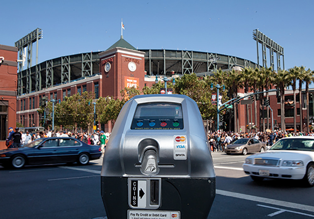 The San Francisco Municipal Transportation Agency's SFpark charges the lowest possible hourly rate to achieve optimum parking availability, defined as having at least one space available on each block most of the time. When and where it is difficult to find a parking space, or where there are too many spaces, rates will increase or decrease incrementally until the right balance is achieved to reach that goal. Left: An SFpark meter outside AT&T Park.