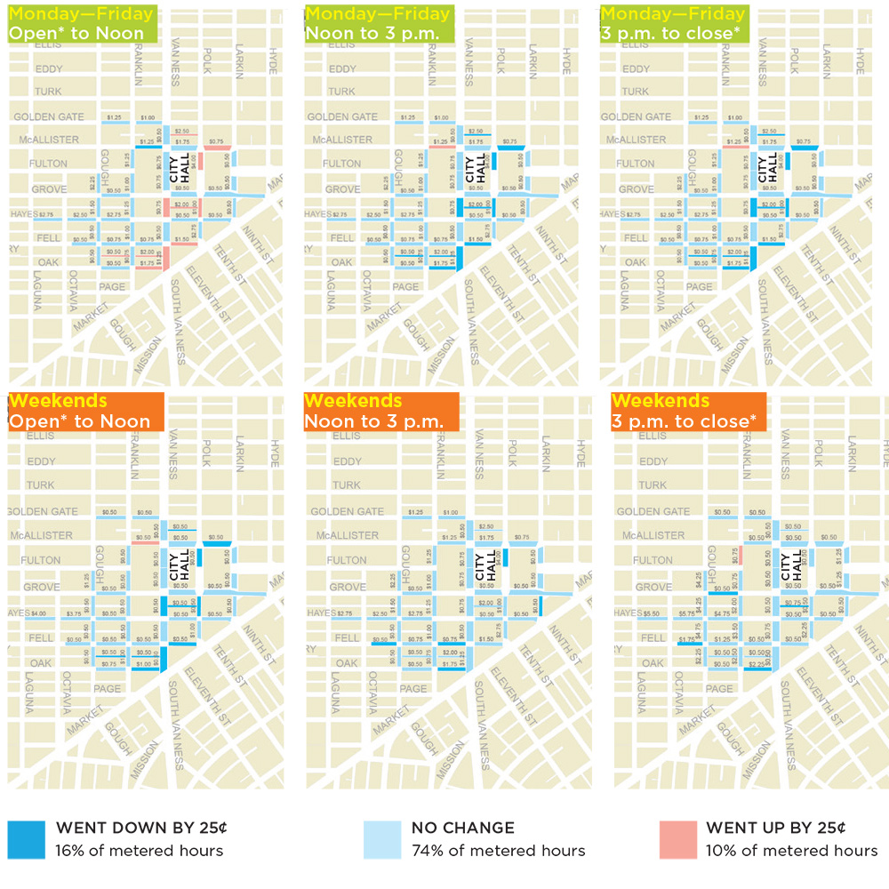 *In this pilot area, on-street, noncommercial meters operate Monday through Saturday from 7 a.m. to 6 p.m., 8 a.m. to 6 p.m., or 9 a.m. to 6 p.m. SOURCES: DELIVERING PROGRESS, SFMTA 2016 ANNUAL REPORT AND SFPARK JANUARY 2017 PRESS RELEASE.