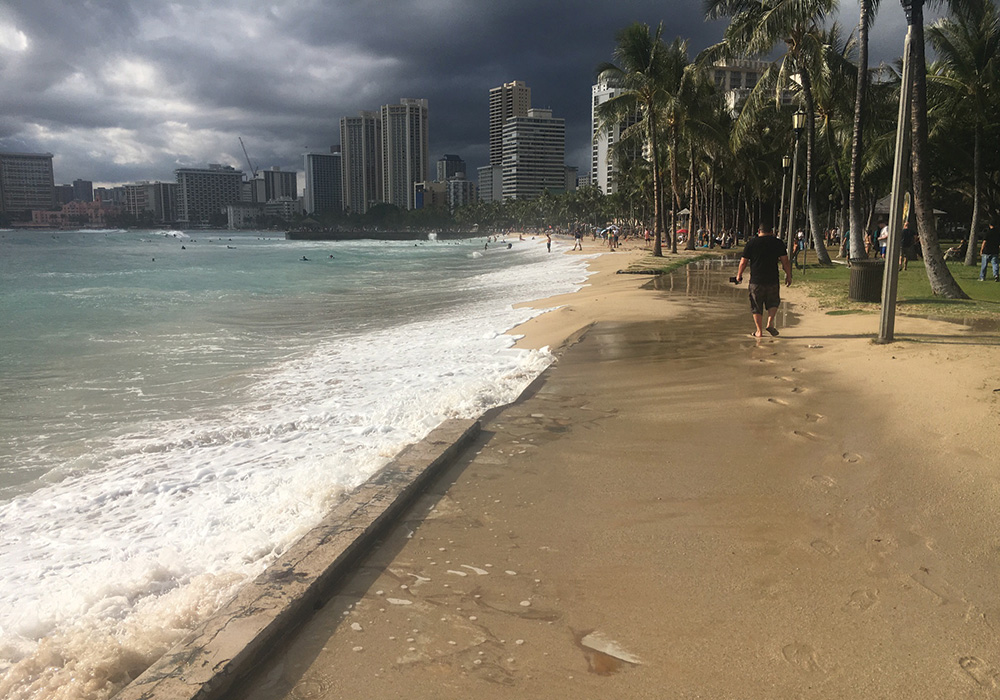 A historically high tide washes up over Queens Beach in Waikiki over Memorial Day weekend. King Tides — the highest annual astronomical tides — occur regularly in the summer and winter months in Hawaii, but this year's have been higher than normal with rising global sea levels caused by climate change. The University of Hawai‘i Sea Grant College program, through its Hawai‘i and Pacific Islands King Tides Project (PacificIslandsKingTides.org), is educating and engaging citizen scientists in documenting these high-water-level events. Photo by user Rafberg81, courtesy Hawai‘I Sea Grant King Tides Project.