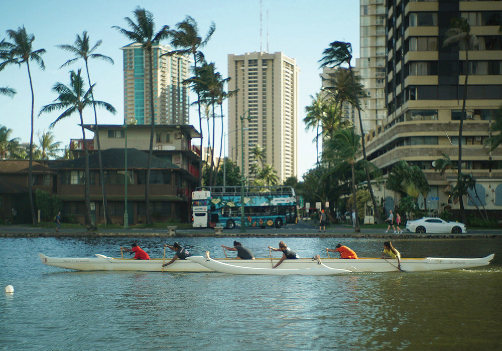 Canoe paddlers on the Ala Wai Canal rode a little higher than usual after a king tide at the end of May left the water only about a foot below the top of a retaining wall. Photo by Cory Lum/Civil Beat.