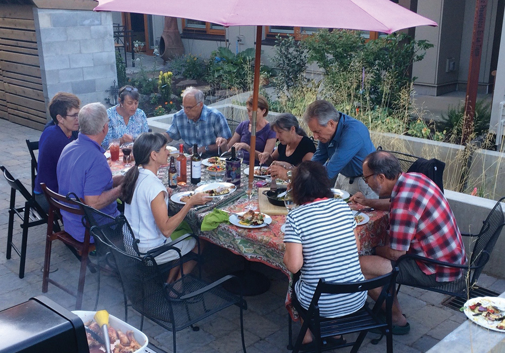 Ankeny Row residents gather to share a potluck meal in the complex's shared courtyard following a monthly partner meeting. Photo courtesy David Seigel.