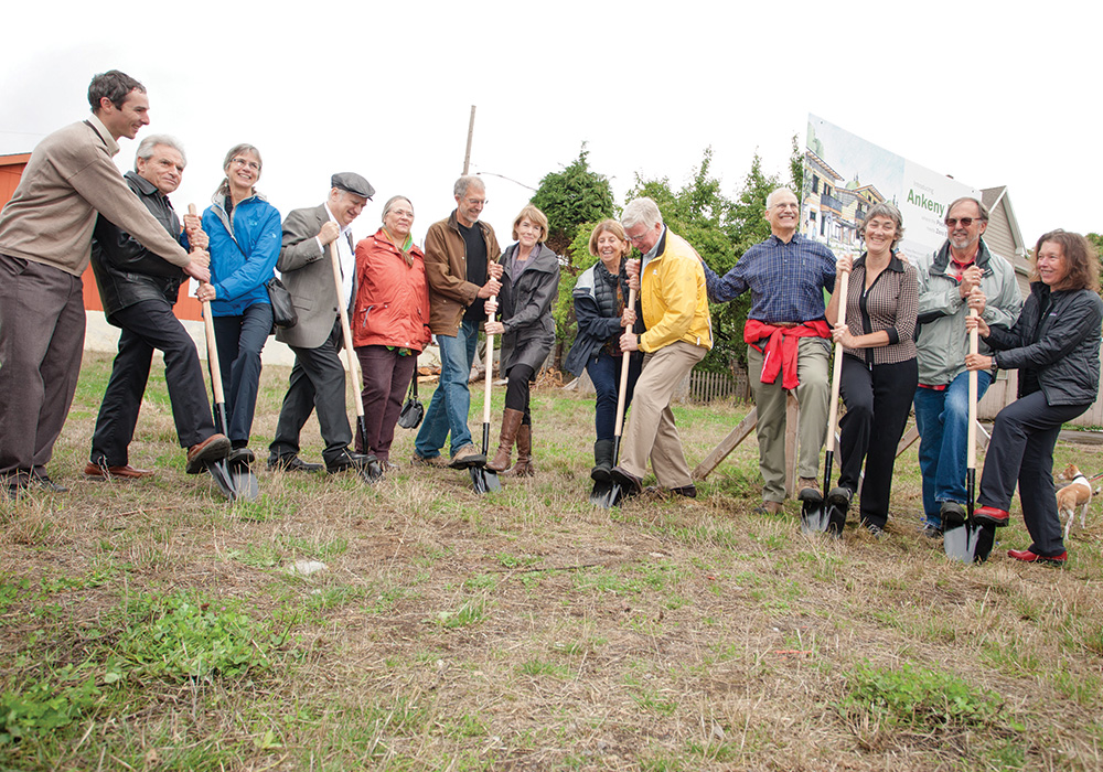 The owners of Ankeny Row celebrate its groundbreaking in 2013. Wolfgang Feist (fourth from left, in a black cap), the co-originator of the Passive House concept and founder of the Passivhaus Institut in Germany, joined them. Built to Passive House standards, Ankey Row's units are so efficient that they can be run by the energy produced by 3,500 square feet of solar panels on the roof. Photo by Lucas Balzer.