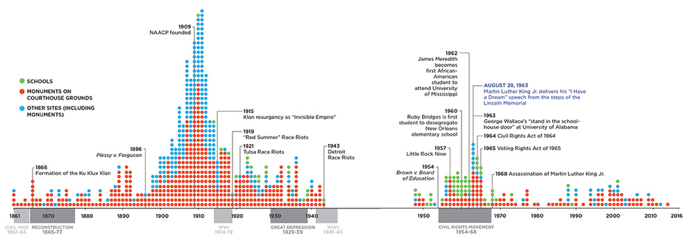 Southerners began honoring the Confederacy immediately after the Civil War, but the eras of Jim Crow laws and the civil rights movement saw significant increases in the number of monuments and other symbols, with big spikes 50 and 100 years after the war, as this time line shows.
