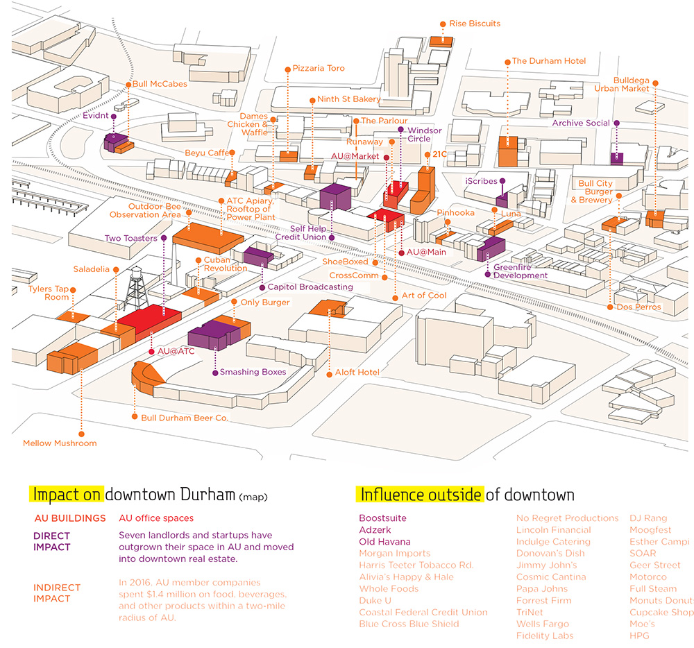AU is one player in Durham's expanding entrepreneurial ecosystem, which was mapped in "From Factory Town to Vibrant Innovation Center" (tinyurl.com/y8ps3pd9) in 2017 by University of North Carolina planning professor Emil Malizia.