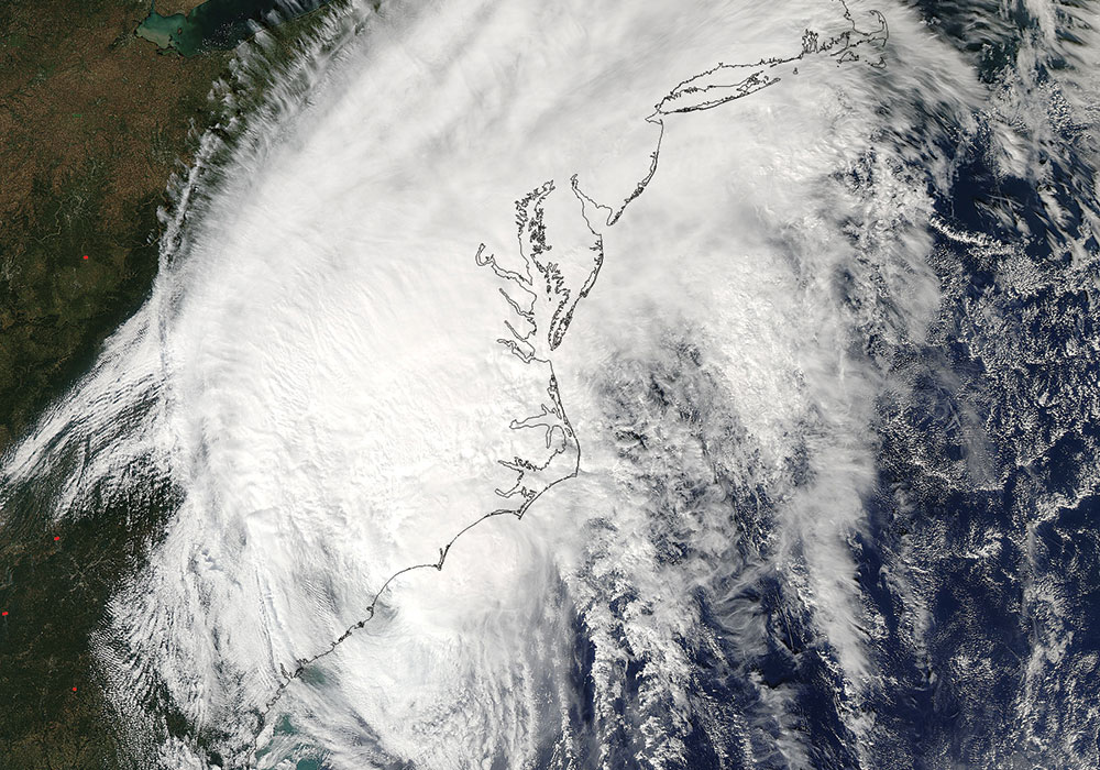 Huge bands of rain are seen in this satellite image of Hurricane Matthew just before it made landfall in South Carolina last October. Photo by Jesse Allen, courtesy NASA Earth Observatory.