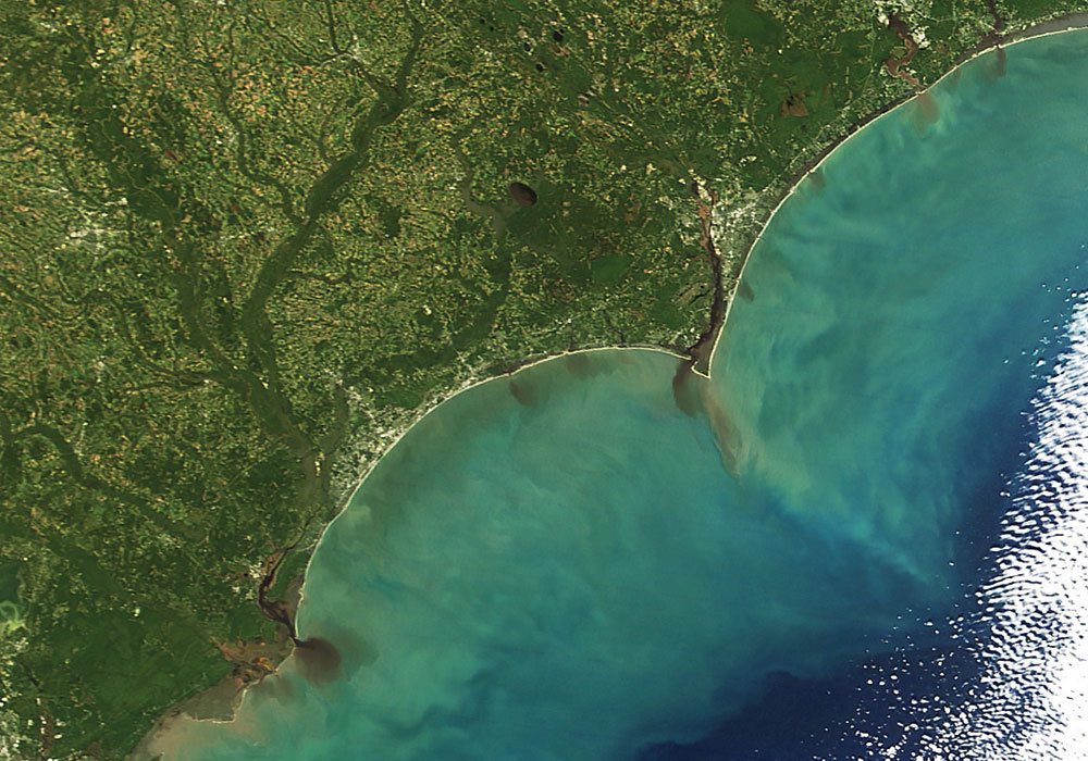 Although its winds had weakened as it moved north, Hurricane Matthew delivered record-breaking rainfall to parts of the Southeast. NASA's Terra satellite captured this image of floodwaters laden with sediment pouring out from several rivers in North Carolina and South Carolina. Dissolved organic matter may have contributed to the dark color of the river water as it spilled into the Atlantic Ocean. Photo by Jeff Schmaltz and Adam Voiland, NASA.