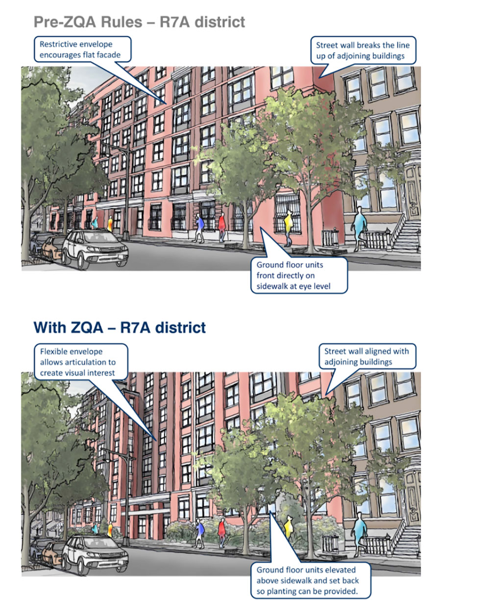 Zoning for Quality and Affordability: New York's ZQA, adopted in 2016, addresses previous zoning regulations that discourage affordability and quality buildings today. This example shows how ZQA would enhance the visual interest and attractiveness of a general residence district. Renderings and source material: New York Department of City Planning.