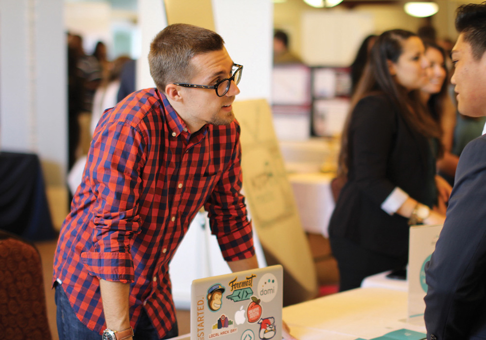 Lucas Lindsey talks with students at a career fair about internship opportunities with Domi Station, the startup incubator in Tallahassee, Florida, where he is the executive director. Photo Courtesy Florida State University.