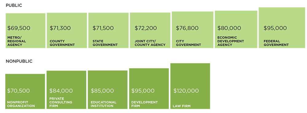 The answer depends on a few variables, and every other year, APA and AICP conduct the Planners Salary Survey to find out. The difference can come down to experience level, of course, and AICP status. In fact, the typical AICP member takes home about $16,000 more than an equivalent planner without the certification. What really can make a difference, though, is where you are employed. About 70 percent of planners surveyed work for a public entity, but their median salary is about $2,000 less than the field's overall median, $77,000.