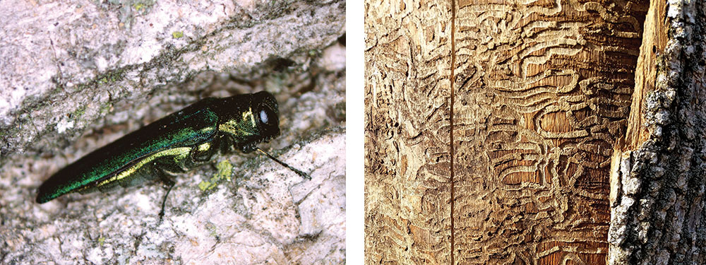 EAB larvae burrow under the bark of ash trees, leaving behind s-shaped tunnels, thinned canopies, and dead branches as they feed. Left photo by U.S. Department of Agriculture, Flickr (CC BY-ND 2.0). Right photo by Anna Hesser, Flickr (CC BY-NC-ND-2.0).