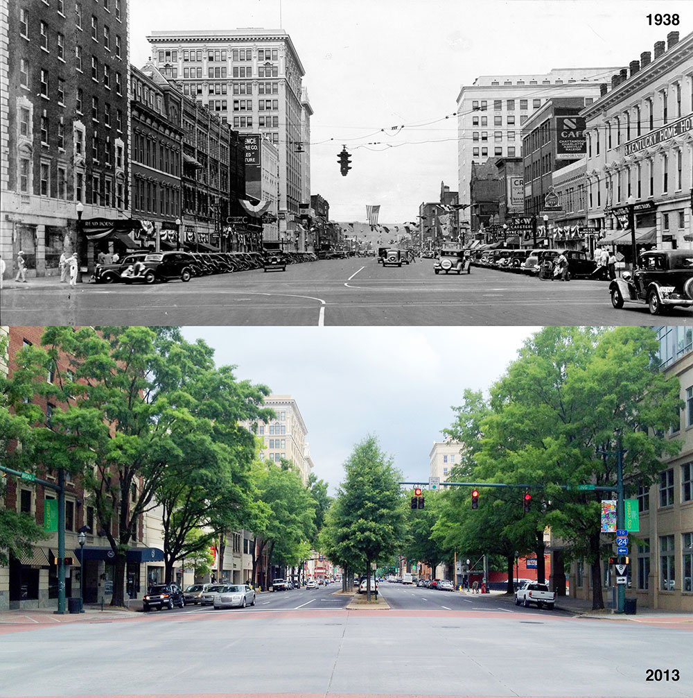 Chattanooga's Central Business District is one neighborhood that has been transformed with the addition of street trees. In the 1960s, the tree-lined center median was installed, and the result is a downtown with a healthy tree canopy that not only makes the neighborhood vibrant and attractive, but also livable. Photos courtesy Gene Hyde.