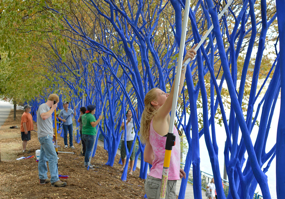 Last year Chattanooga was the first city in Tennessee to host a Blue Trees exhibition by Australian artist Konstantin Dimopoulos. Using a combination of water and blue chalk, Dimopoulos colored trees along Riverfront Parkway a striking shade of indigo to spark conversation about the value of trees.