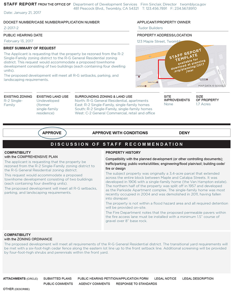 Pedrotti advises planners to think of the staff report as a webpage. "People are going to click around," he says, to the information that is relevant to them.
