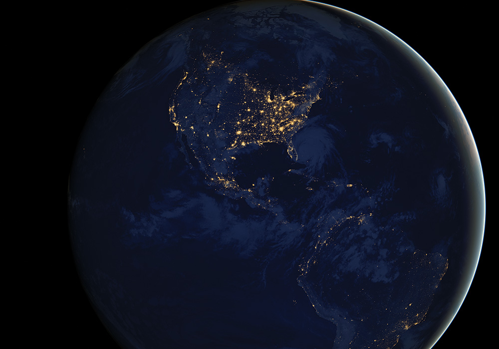 Composite image of North America at night assembled from data acquired by the Suomi NPP satellite in 2012 using the Visible Infrared Imagining Radiometer Suite, which detects light in a range of wavelengths and uses filters to observe dim signals such as city lights. Source: NASA.
