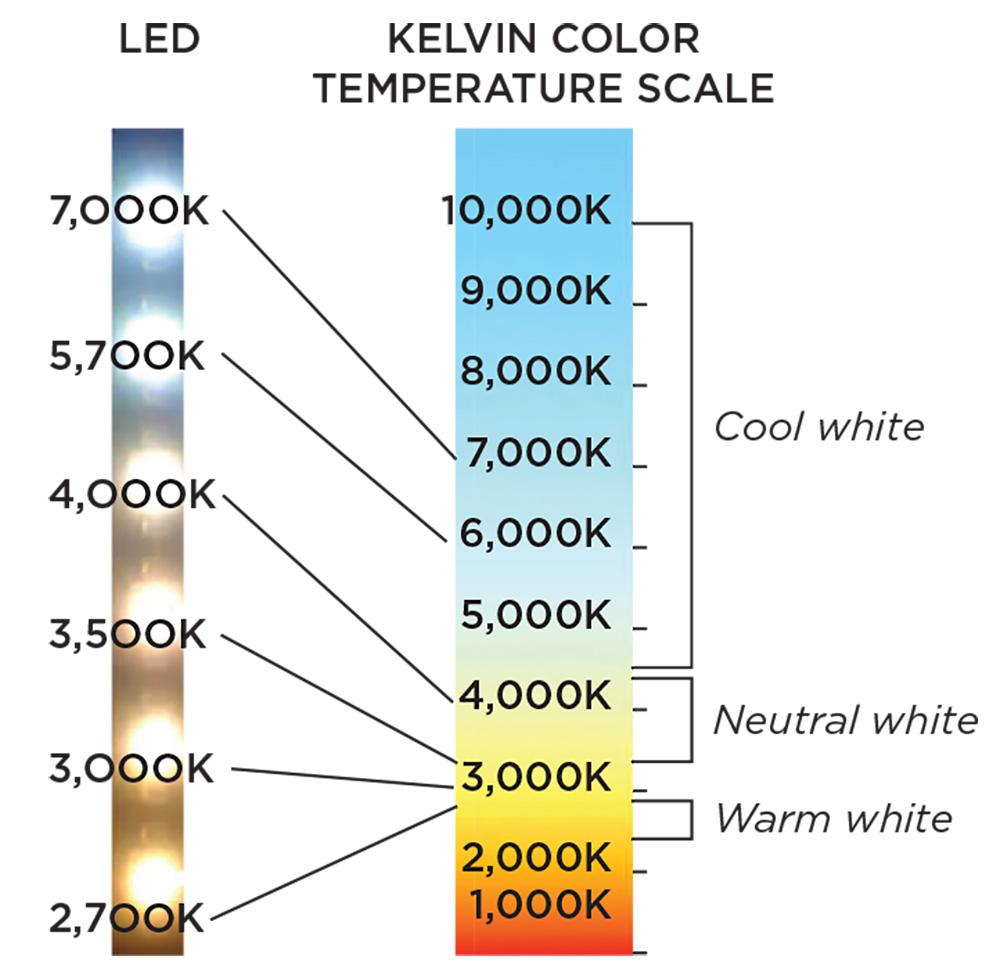 For some of us non-physicists, it's bizarre. The scale's range is based on what a piece of metal would look like if heated. At 2,000 to 3,000 Kelvin, you get light that is white but warm, such as you might want for your bedroom. At higher Kelvins, the light "cools" and brightens. At 4,600 to 6,000 K, it's whitish to blue, more like daylight — or, as in my front yard in January, like a police lineup.