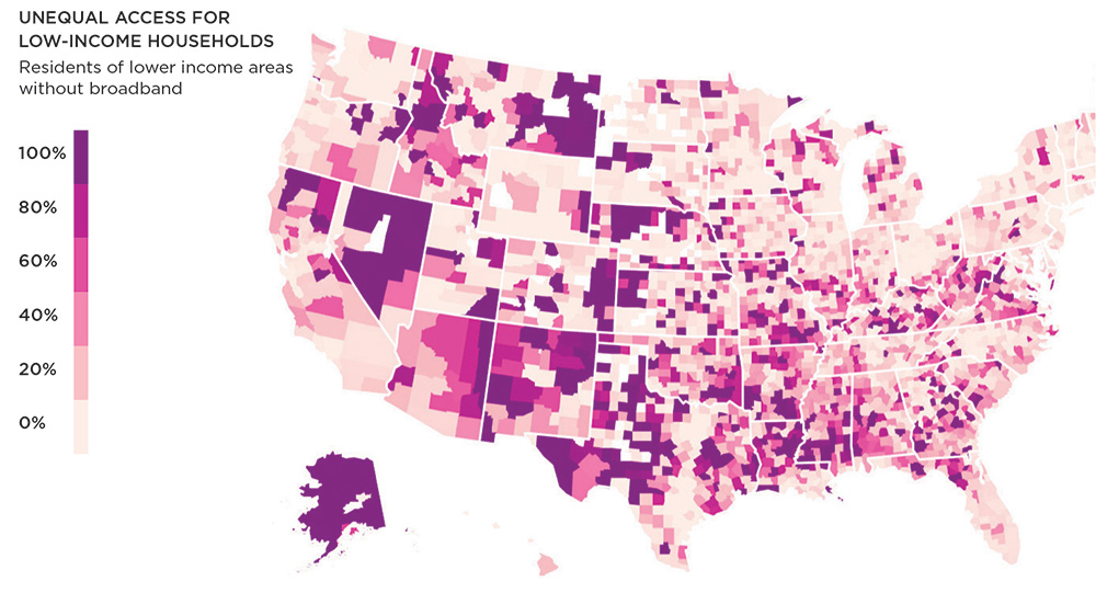 Nearly a quarter of Americans are without broadband. For some households, it's a matter of geography; others simply can't afford the bill. Using census block data and the federal standard for broadband download speeds, this interactive map from The Center for Public Integrity shows the relationship between low-income areas and high-speed internet access. At tinyurl.com/yc6tfuf4, users can zoom in for a county-specific look at digital inequality.