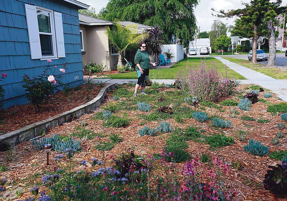A gardener in Long Beach, California, shows off her drought-tolerant front-yard garden. She took part in a city program that offers rebates to residents who replace their lawns with plants that require little water. Photo by Nick Ut/AP Photo.