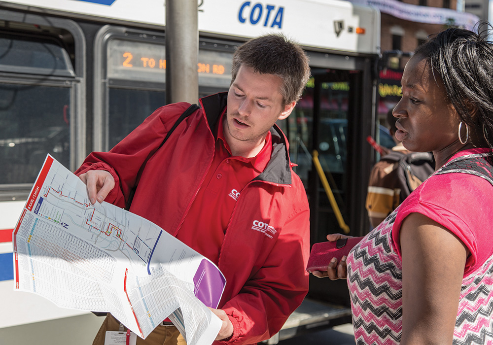 A COTA employee helps a rider navigate the new bus routes on launch day, May 1, 2017.